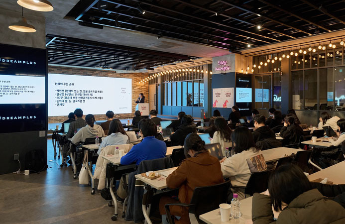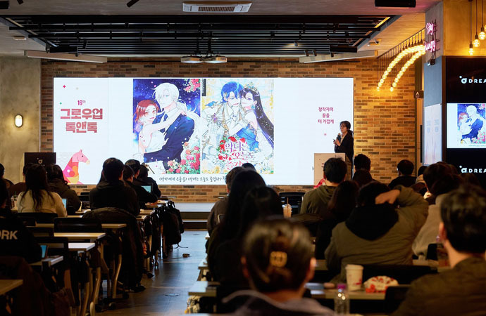 이번 16회 강연에는 ▲양치기자리 작가(‘웹소설은 숏폼이 아니다’) ▲화람 작가(‘지속 가능한 노블코믹스 웹툰 작가로 살아남기’) ▲스튜 작가(‘캐릭터 디자인부터 완결까지, 로판 작화가가 하는 일’)가 연사로 참여했다. 강연에서는 연재형 서사의 구조 설계, 장르 특성에 맞는 캐릭터 구축, 데뷔 이후 커리어 관리 전략 등 현업 경험을 기반으로 한 구체적인 사례가 공유됐다. 작가들은 실제 작업 콘티와 제작 과정을 공개하고, 안정적인 연재를 위한 작업 루틴과 자료 조사 방법 등을 설명하며 현장의 높은 호응을 얻었다.