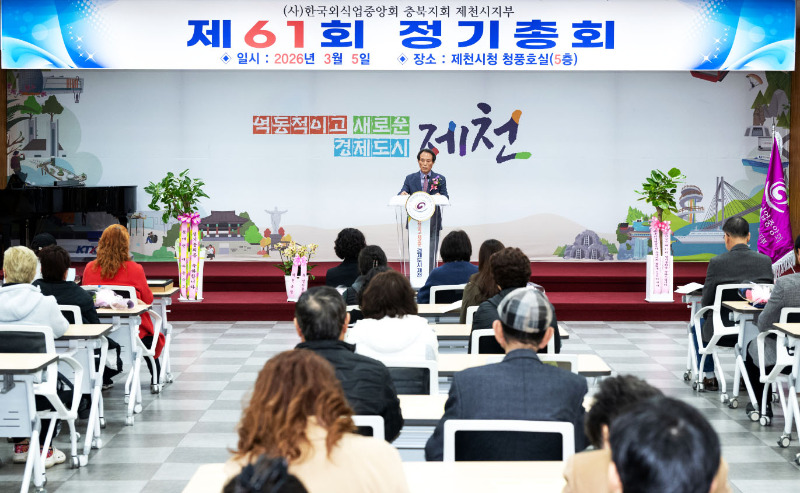 한국외식업중앙회 ㅊ우북지회 제천시지부는 지난 5일 제천시청 청풍호실에서 제 61회 정기총회를 열고 지역 내 어려운 이웃돕기 성금 150만원을 기탁했다.