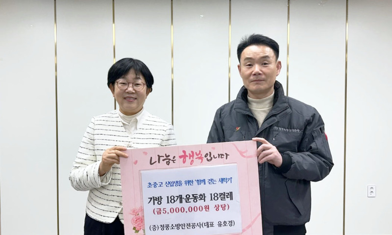 ㈜청풍소방안전공사 유호경 대표는 제천시 중앙동행정복지센터를 방문해 관내 초·중·고 신입생들을 위해 약 500만 원 상당의 가방과 운동화를 후원했다.