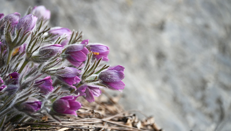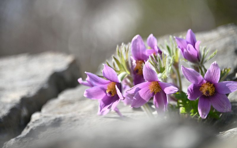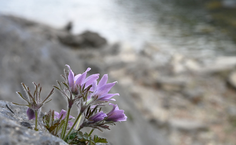 바위 틈 사이에서 자라는 동강 할미꽃은 척박한 환경 속에서도 고개를 숙인 채 보랏빛 꽃을 피워내는 모습이 특징이다.