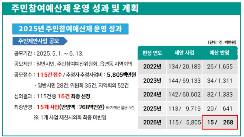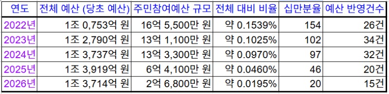 가장 눈에 띄는 대목은 전체 예산 대비 주민참여예산의 미미한 비중이다. 2026년 제천시 당초 예산은 1조 3,714억 원으로 , 주민참여위원회에서 선정된 예산은 고작 2억 6,800만 원(15건)에 불과했다. (5년 평균 반영 채택율 약20%)