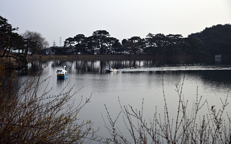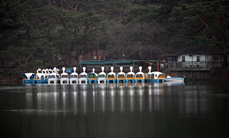 줄지어 정박해 있는 오리배들은 또 다른 장면을 만든다. 가지런히 늘어선 모습은 정지된 듯하지만,