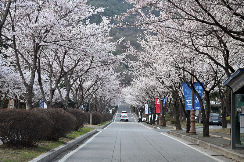 캠퍼스 곳곳에 흐드러지게 핀 벚꽃은 도로와 산책길을 따라 이어지며 하나의 ‘꽃 터널’을 만들어냈다. 차량이 천천히 지나가는 길 위로, 바람에 흩날리는 꽃잎들이 내려앉으며 봄의 시간을 완성한다.