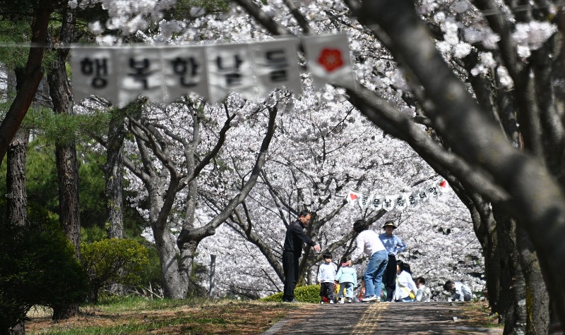 ‘행복한 날들’이라는 문구가 걸린 벚꽃길은 그 자체로 하나의 메시지처럼 다가온다.