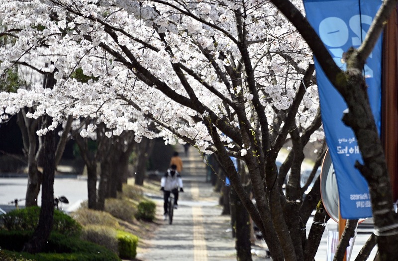충북 제천 세명대학교 캠퍼스에 벚꽃이 만개하며 봄의 정취를 한껏 끌어올리고 있다.