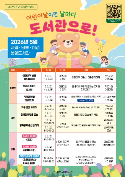 이번 행사는 5월 한 달간 시립·남부·여성·봉양도서관에서 어린이실 이용자를 대상으로 진행되며, 체험과 이벤트 중심의 다양한 프로그램이 운영된다.