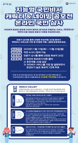 투표는 광화문 1번가를 통해 국민 누구나 참여할 수 있으며 캐릭터 후보작 중에서 국민비서 서비스를 가장 잘 설명하면서도 완성도가 높은 1건을 선택하면 된다.