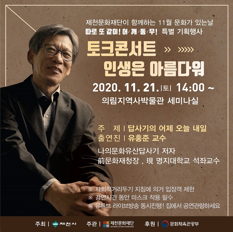 재단은 코로나 19 확산방지를 위하여 온라인 라이브방송 토크콘서트(초청) 강연을 기획하였으며,21일(토)에 의림지역사박물관 세미나실에서 다양한 장르의 토크콘서트를 제공하고자 “나의문화유산답사기” 저자이자 前문화재청장, 現 명지대 석자교수인 유홍준 교수와 KBS1 6시내고향 ‘발길따라 고향기행’ 고정리포터 겸 국악인으로 활동하는 최예림 씨를 초청하여「인생은 아름다워 토크콘서트」를 현장 라이브방송으로 하고 오는 25일 10시에 녹화분 방영도 진행한다고 밝혔다.