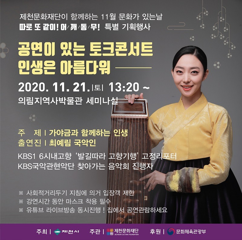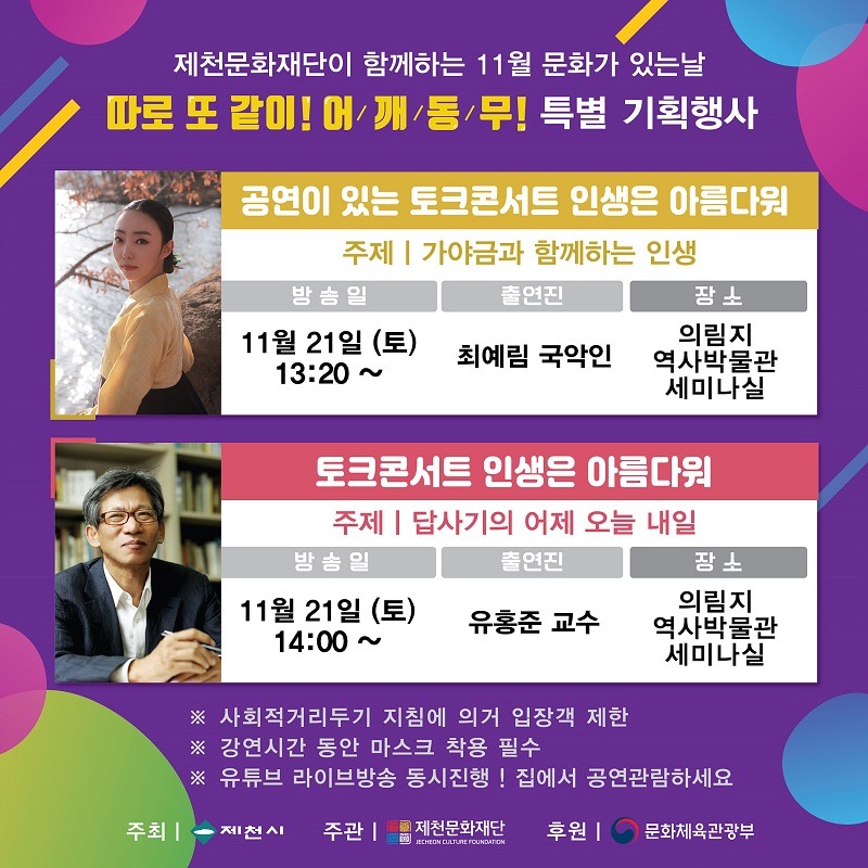한편, 11월 행사 관련 자세한 내용은 제천문화재단 홈페이지(http://www.jccf.or.kr)에서 확인할 수 있다.