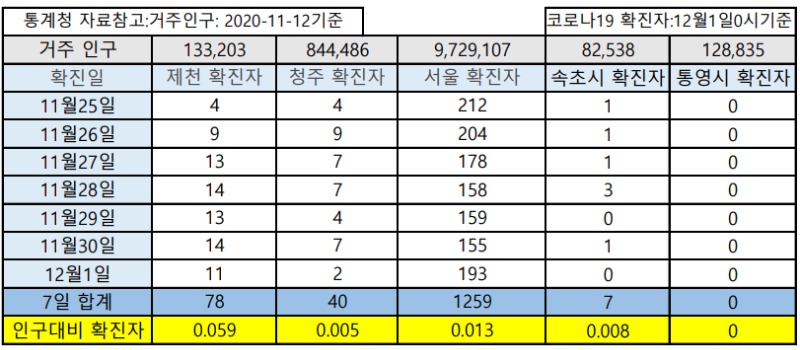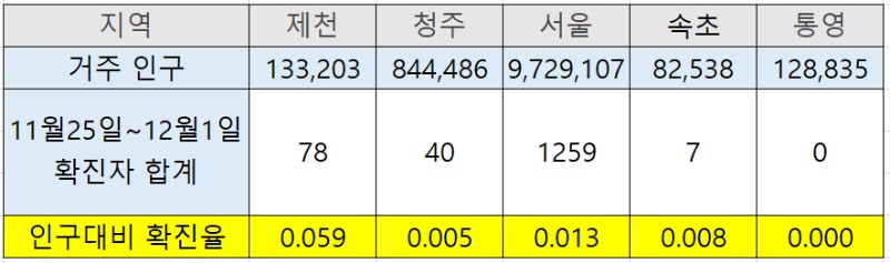 위표는 JD News에서 지난 달 11월 25일 부터 이달 1일, 총 7일동안 제천을 기준으로 서울,청주,속초,통영5개 지역을 통계청 자료와 지자체 보건소 확진현황을 참고해 자체 조사한 결과다.
