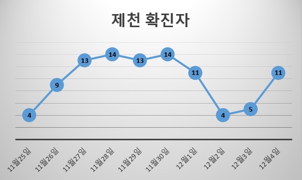 12월 2일 4명, 12월 3일 5명 나오면서 조금 주춤하는 듯 하였으나 12월4일 다시 11명이 나오면서 제천 방역당국이 긴장하고 있다.