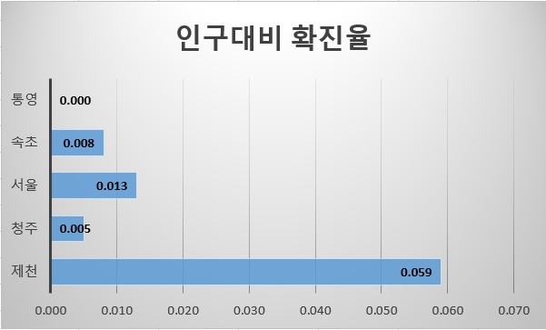 같은 기간 인구 972만9107명의 서울에서의 확진자는 1259명으로 제천보다 훨씬 많은 확진자가 발행했으나 전체 인구 비율을 비교하면 0.013이며, 제천이 서울보다 4배나 높다.