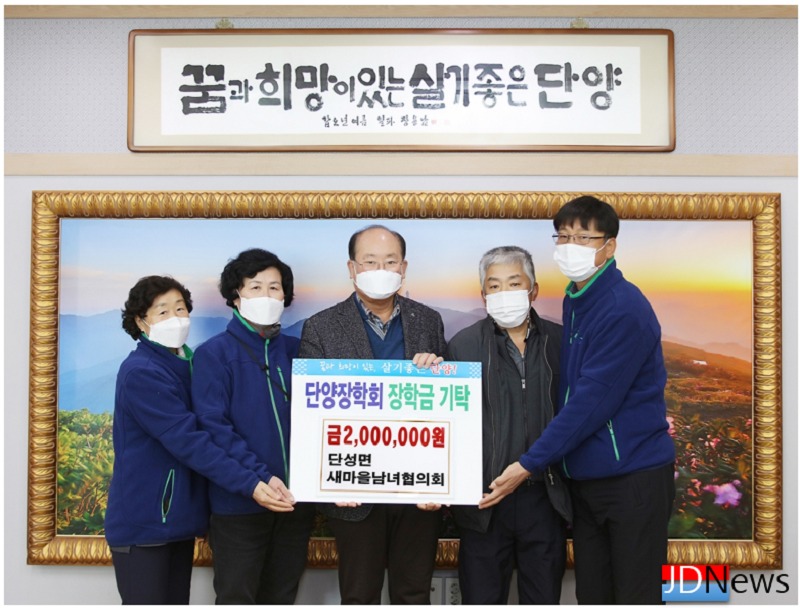 JD News 이용희 기자 = 단양군 단성면 새마을남녀협의회(회장 이찬희, 남철남)는 지난 15일 단양군청을 방문해 지역인재 양성을 위해 사용해 달라며 장학금 200만원을 기탁했다.