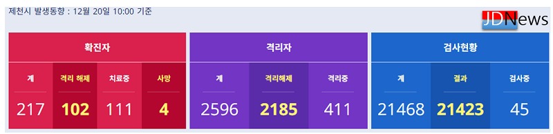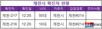 20일 확진된 2명은 어제 제천 214번 확진자의 딸과 손녀로서 가족 간 접촉에 의해 전파되었다.