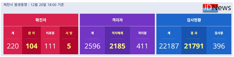 JD News 이용희 기자 = 충북 제천서 신종 코로나바이러스 감염증(코로나19) 확진자가 1명 추가되며 일일 누적 5명이 됐다.