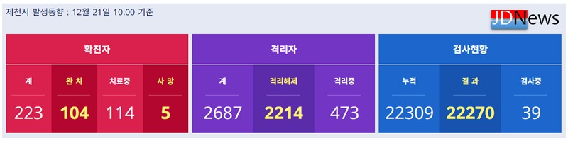 제천의 누적 확진자는 223명이며, 이중 5명이 사망했고 114명이 치료받고 있다.
