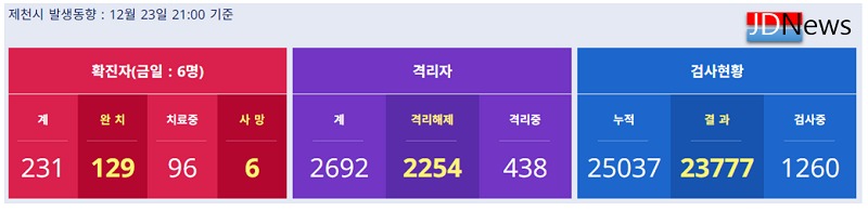 23일 현제 6명의 확진자가 발생했고 누적확진자는 231명이다. 이중 6명이 사망했고 129명이 완치 됐다.
