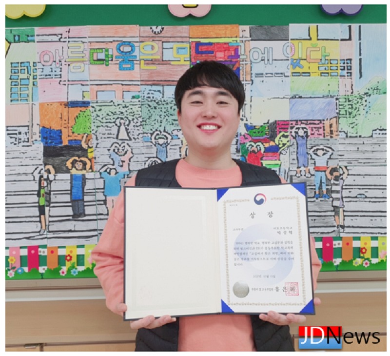 JD News 이용희 기자 = 충북 제천 내토초등학교(교장 조기자) 5학년 2반 담임 박상혁 교사는 EBS와 월드비전에서 주최하고 교육부에서 후원하는 ‘교실에서 찾은 희망’ 캠페인에서 교사 부문 최우수상인 교육부장관상을 수상했다.