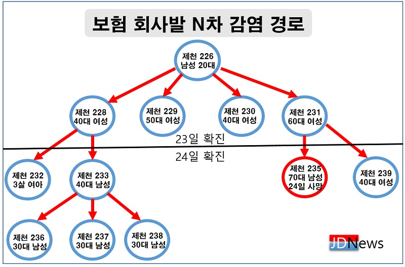 JD News 이용희 기자 = 충북 제천서 보험회사발 신종 코로나바이러스 감염증(코로나19) N차 연쇄감염이 확산하고 있어 지역사회가 공포에 떨게 됐다.