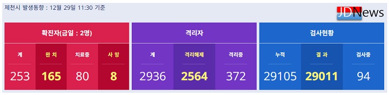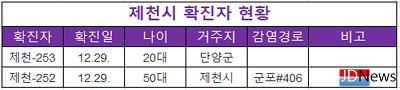 한편 다른 확진자 1명은 단양군 소재 성신양회 직원으로 지난 12월 23일 검사에서는 음성판정을 받았으나, 증상이 발현되어 다시 검사한 결과 오늘 양성 판정을 받으며 29일 신규 확진자는 2명이다.
