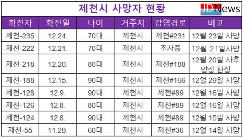 JD News 이용희 기자 = 충청북도 제천서 신종 코로나바이러스 감염증(코로나19)으로 8번째 사망자가 발생했다.