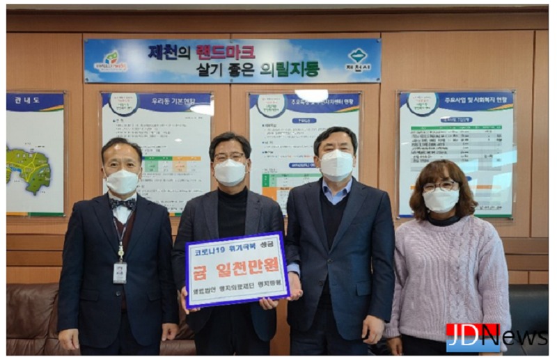 JD News 이용희 기자 = 제천시 고암동에 소재한 의료법인 명지의료재단 명지병원에서 고통분담 성금 1천만 원을 의림지동 행정복지센터(동장 이성호)에 기탁하였다.