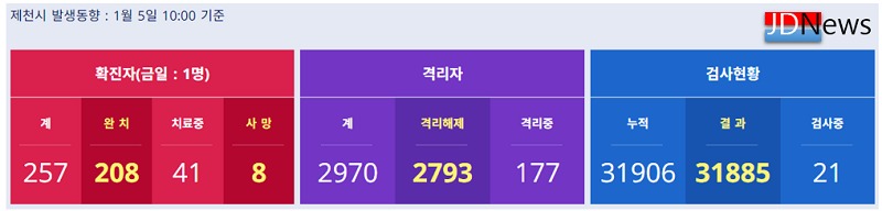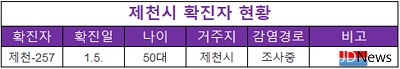 JD News 이용희 기자 = 충북 제천지역에 신종 코로나바이러스 감염증(코로나19) 확진자가 1명 추가 되며 누적 257명이 됐다.