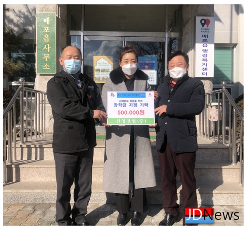 같은 날 신영건설㈜(대표 전혜란)에서도 장학금 50만원을 전달했으며, 지난달 24일에는 매포읍 하시리 마을회(노인회장 하명래, 이장 백홍숙)에서 어려운 이웃을 위해 사용해달라며 성금 100만원을 매포읍지역사회보장협의체에 기탁했다.