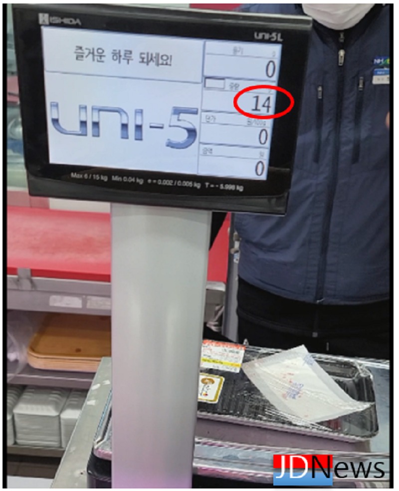 또한 돼지고기는 100g당 2100원 하는 삼겹살 628g(1만3180원)은, 실제 610g 으로 18g을 속여 판매한 것이다.