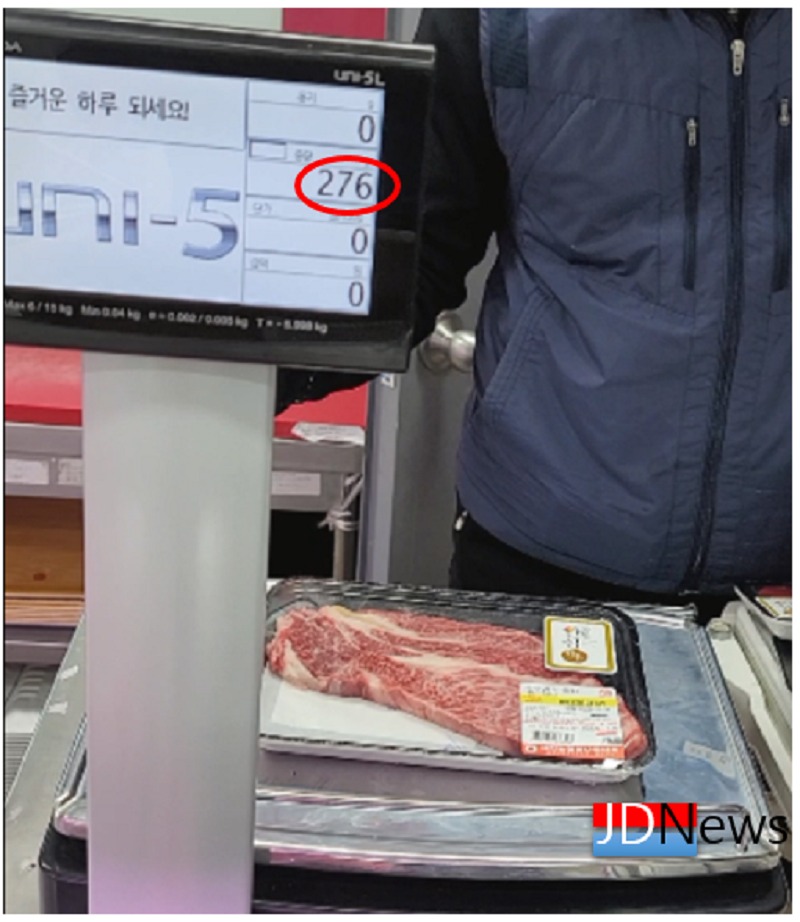 지난 1일 하나로마트는 100g당 1만원 하는 소고기 등심을 포장지에 276g(2만7600원)으로 표시돼 있지만, 실제 소고기 등심 무게는 262g 인 것으로 드러나 포장지 14g을 더 받은 것으로 들어났다.