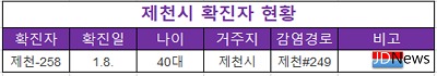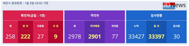 현제 제천시 확진자는 258명이며, 이중 9명이 사망했고 27명이 치료중이다.