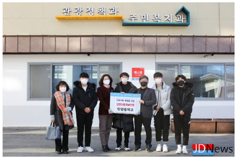 JD News 이용희 기자 = 단양중학교(교장 김명수)는 지난 1월 7일 3학년 학생들이 졸업 기념으로 마음을 모아 동절기 이웃을 위해 써달라며 지역화폐 46만원을 기부했다고 밝혔다.