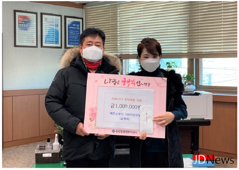 JD News 이용희 기자 = 김종희 제천소방서 119구조대장이 중앙동행정복지센터(동장 송경순)를 방문하여 코로나19 취약계층 지원금 100만원을 기탁했다.