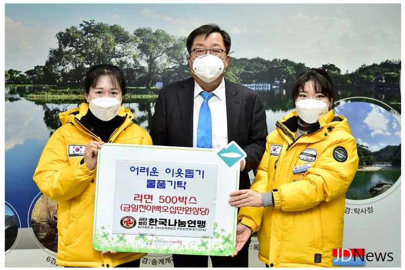 JD News 이용희 기자 = 사단법인한국나눔연맹(이사장 안미란)은 지난 12일 소외되고 어려운 이웃에게 전해달라며 사랑의 라면 500박스(약 1,250만원 상당)을 제천시에 기탁했다.