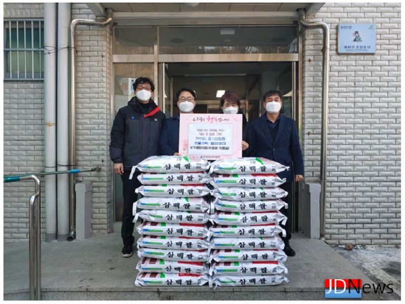 JD News 이용희 기자 = KT 제천지점(지점장 이종섭)은 지난 12일 중앙동행정복지센터를 방문하여 코로나19 극복을 위한 성금 120만원과 쌀20포대(100만원상당)를 기탁하였다.