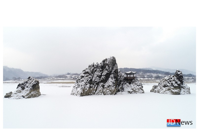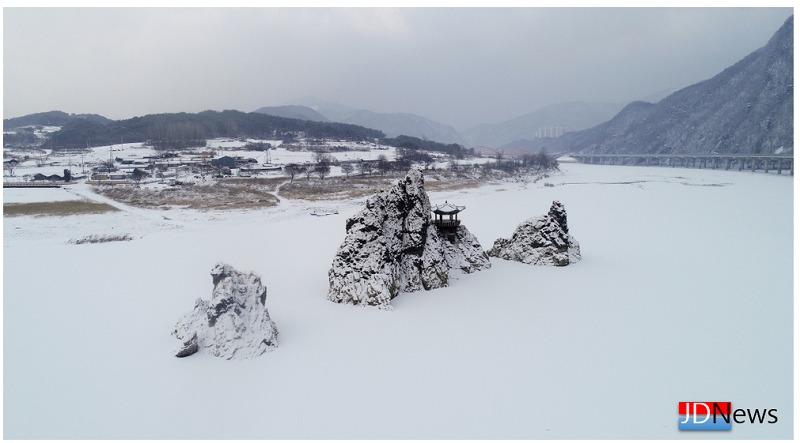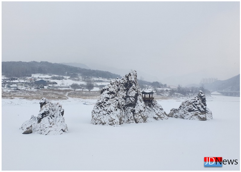 JD News 이용희 기자 = 대설주의보가 발효 중인 지난 18일 충북 단양군의 도담삼봉을 하얀 눈이 살포시 감싸 아름다운 설경(雪景)을 뽐내고 있다.