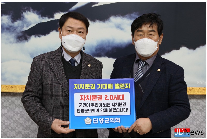 JD News 이용희 기자 = 단양군의회 장영갑 의장과 오시백 부의장은 지난 19일 자치분권 2.0시대 개막을 응원하기 위해 ‘자치분권 기대해’ 챌린지에 동참했다.