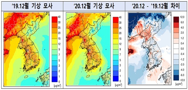 국내외 배출량을 동일한 값으로 고정하고 2019년과 지난해의 각 12월 기상 상황을 모델링에서 구현해 비교한 결과, 2019년 12월 대비 지난해 12월 농도 개선폭(-1.7㎍/㎥, 25.8→24.1㎍/㎥)의 약 12%(-0.2㎍/㎥)가 기상영향에 따라 개선된 것으로 분석됐다.