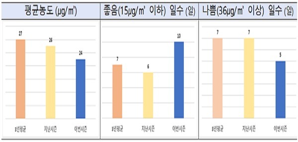 먼저 2차 계절관리제 시행 첫 달 초미세먼지(PM2.5) 농도는 과거 대비 전반적으로 개선된 것으로 나타났다.