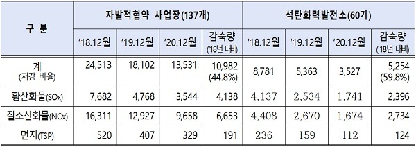 지난해 12월 한 달간 추진된 2차 계절관리제 정책과제의 이행 실적을 분석한 결과 특히 자발적 감축협약 사업장과 석탄화력발전에서 대기오염물질 배출량 감축 실적이 큰 것으로 나타났다.