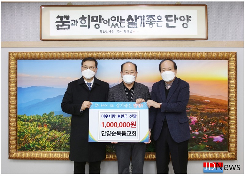 JD News 이용희 기자 = 단양순복음교회(담임목사 김성진)는 지난 20일 단양군청을 방문해 동절기 어려움이 가중되는 취약계층을 위해 사용해 달라며 100만원의 후원금을 전달했다.