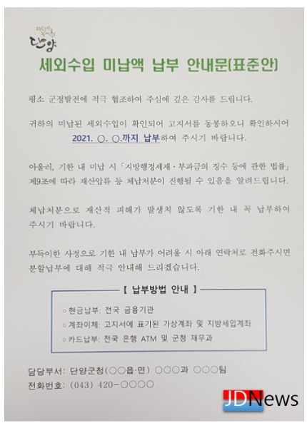 JD News 이용희 기자 = 충북 단양군이 ‘2021년 세외수입 조기 징수체계’ 구축을 위해 미납고지서 발송 시 납부 안내문을 동봉 발송한다고 지난 1일 밝혔다.