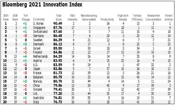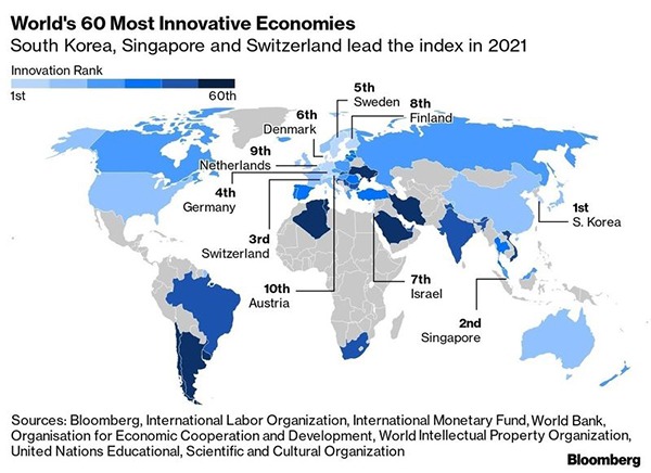 JD News 이용희 기자 = 한국이 ‘2021년 블룸버그 혁신지수’ 세계 1위를 차지했다.