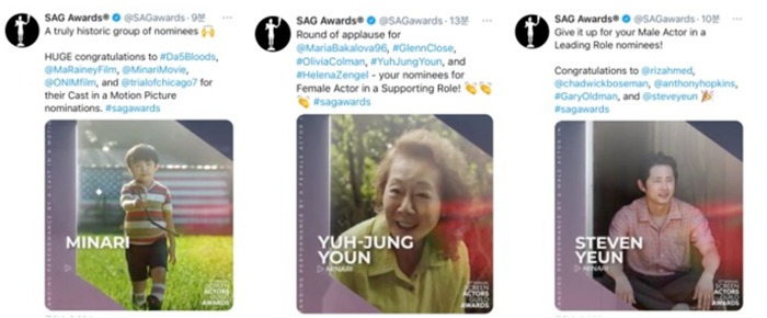 <미나리>가 영화 부문 앙상블상, 여우조연상, 남우주연상에 노미네이트된 미국배우조합상은 미국 배우 조합이 주최하며 영화와 TV에서 활약하고 있는 미국 내 모든 배우들이 동료 배우들을 대상으로 상을 주는 시상식이다. 특히 수상작 선정에서 아카데미상을 주관하는 미국 영화예술과학아카데미(AMPAS)와 유사성이 높기 때문에, 골든 글로브 및 크리틱스 초이스 시상식보다 훨씬 더 높은 확률로 오스카 연기상 수상자와 일치하고 있어 ‘미리 보는 오스카’로 불린다.