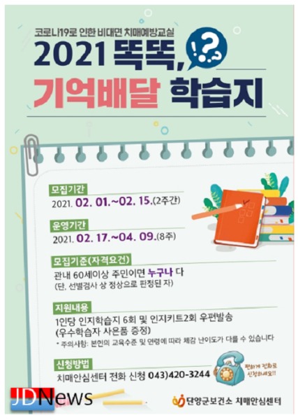 JD News 이용희 기자 = 단양군치매안심센터는 기존 진행하던 대면 프로그램인 치매예방교실을 인지학습지와 인지키트 배송을 통한 비대면 학습프로그램인 ‘똑똑, 기억배달학습지’ 사업으로 전환해 운영한다고 지난 9일 밝혔다.