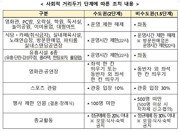 이에 정부는 수도권은 2.5단계에서 2단계로, 비수도권은 2단계에서 1.5단계로 각각 하향했다. 단, 지역별 유행 양상에 따라 비수도권 지자체는 2단계로 상향 조정할 수 있다.