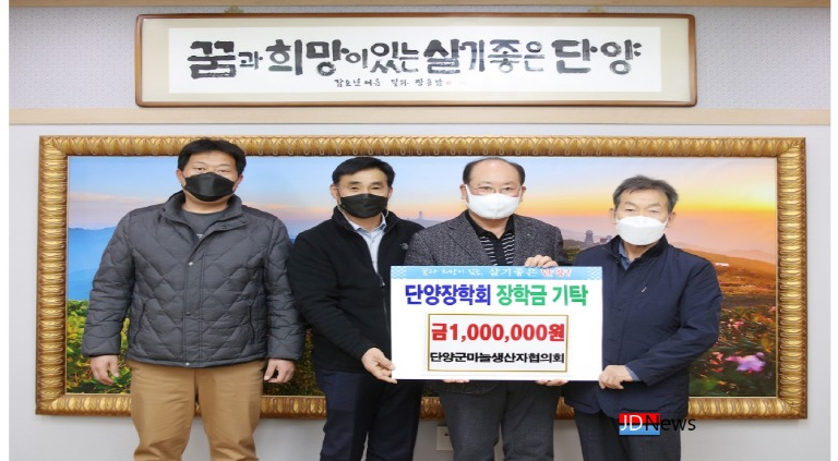 JD News 유소진 기자 = 단양군마늘생산자협의회는 단양장학회에 지역 명문학교 육성과 인재양성을 위해 사용해 달라며 장학금 100만원을 기탁했다.