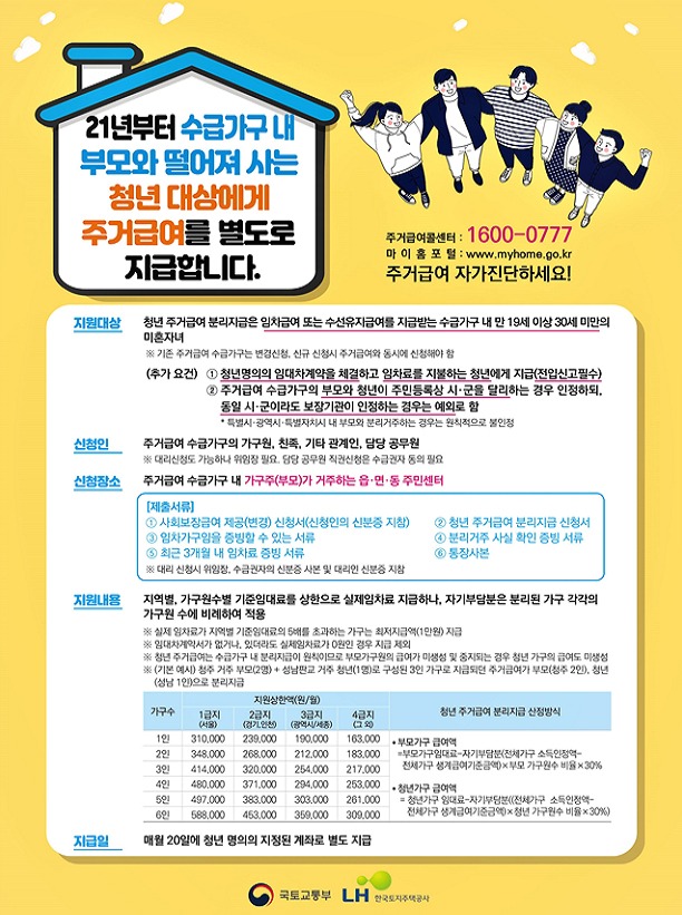 - 만19세 이상 30세 미만 미혼자녀 주거급여 분리지급 가능