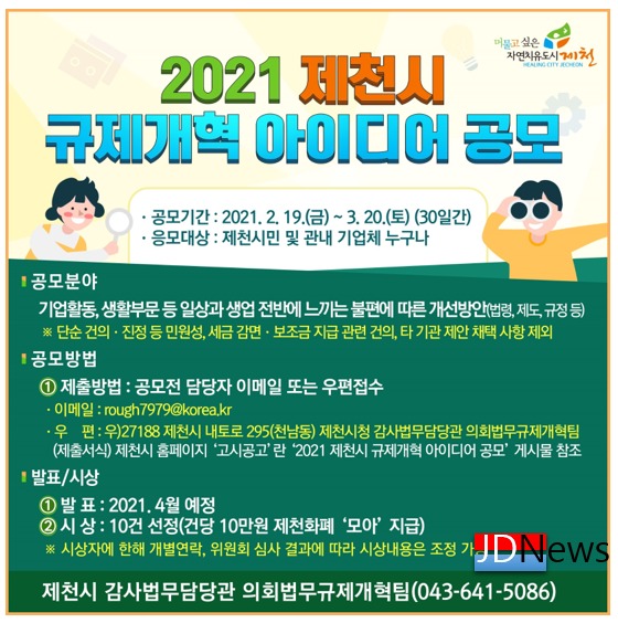 JD News 이용희 기자 = 제천시가 기업 활동에 걸림돌이 되거나 시민생활에 불편을 주는 불합리한 규제를 시민과 함께 발굴하고 개선하기 위해 ‘2021 제천시 규제개혁 아이디어 공모’를 실시한다.