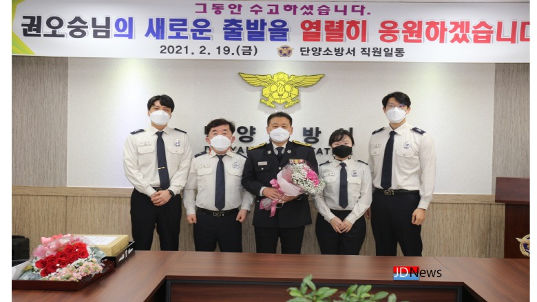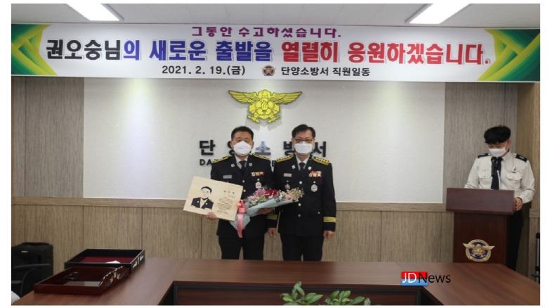 JD News 유소진 기자 = 단양소방서는 소방서 2층 소회의실에서 코로나19로 거리두기하고 있는 사회적 분위기를 고려하여 소규모 인원만 참석한 가운데 조촐하게 소방경 권오숭님의 명예퇴임식을 가졌다.